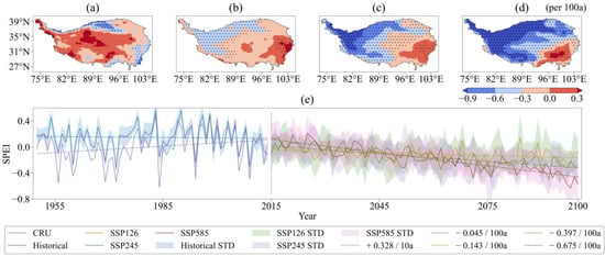 Trend test results of SPEI for the HQ-corrected ensemble model. (a–d) represent the spatial trend of SPEI in the historical and future scenarios, respectively. The black dots are significant points with p < 0.05. (e) represents the change curve of the SPEI of the ensemble model in the historical and future scenarios. The filling on both sides of the line represents the respective standard deviation, and the dashed line is the trend line.