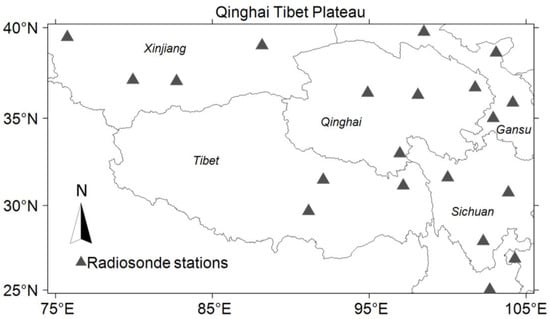 Meteorological profiles of 20 radiosonde stations (see Figure 1) in Qinghai Tibet Plateau, China, are used for model validation. The radiosonde data are obtained from the Integrated Global Radiosonde Archive Version 2 (IGRA2) [], which is maintained by the National Climate Data Center (NCDC) of the United States (ftp://ftp.ncdc.noaa.gov/pub/data/igra (accessed on 1 June 2022)). In order to improve the data quality, Radiosonde profiles with less than ten pressure levels of valid data were excluded. The PWV data from ERA5 and radiosonde can be calculated from an integral of the meteorological data as follows [,]: