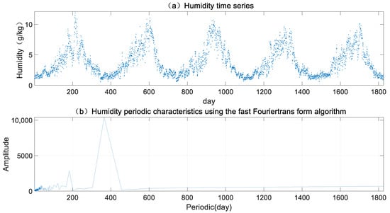 (a) humidity time series at a specific atmospheric pressure of 1000 hPa and (b) its periodic characteristics.