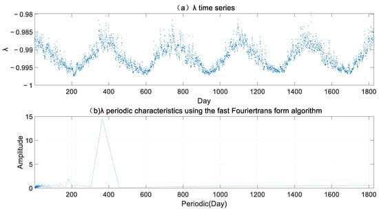 Using the outputs from (1), we can obtain the water vapor decrease factor by (6). The results are shown in Figure 3. Given their significant seasonal nature, we adopt the following seasonal fit formula [] to deduce empirical temporal information for the coefficients and . For , it appears as: