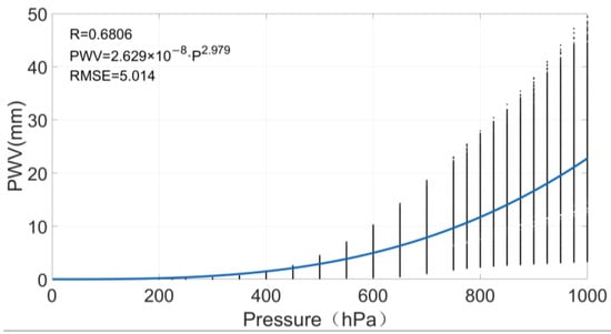 A PWV difference occurs when the elevation difference between the reanalysis product point and the desired position is large []. In this study, we selected the ERA5 atmospheric layered meteorological data from 2015 to 2019 to calculate the PWV of different atmospheric pressure altitude and its corresponding atmospheric pressure according to Equation (1). Then, regression analysis is used to analyze the relationship between PWV and pressure. The results are shown in Figure 4.