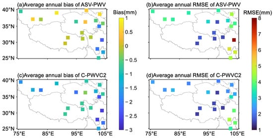 Average annual bias and RMSE of the ASV-PWV and C-PWVC2 in 2020.