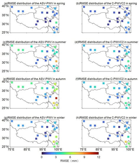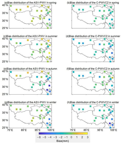 Table 2, Figure 7 and Figure 8 give the statistical bias and RMSE of ASV-PWV and C-PWVC2 models in four seasons of the year. We find that ASV-PWV has the minimum average bias (0.1 mm) and average RMSE (1.81 mm) in spring and has the maximum average bias (−1.34 mm) and average RMSE (4.83 mm) in autumn, respectively. C-PWVC2 has the minimum average bias (−0.99 mm) in autumn and has the maximum average bias (−1.81 mm) in spring. C-PWVC2 has the minimum average RMSE (1.39 mm) in spring and has the maximum average RMSE (3.31 mm) in summer.