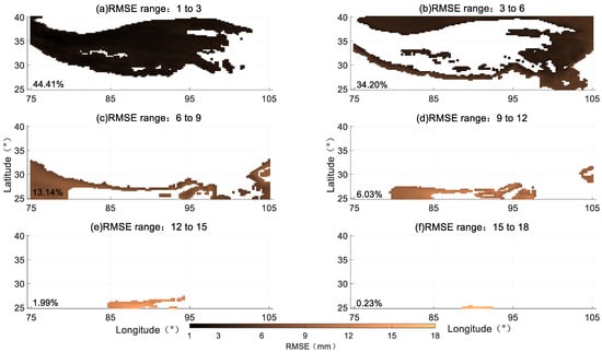 In order to further understand the spatial features of our ASV-PWV model in Qinghai Tibet Plateau, a comparison with PWV data from ERA5 is included in this study. Hence, 7381 grid points in 2020 of ERA5 reanalysis products are adopted. Figure 9 shows that the average annual bias and RMSE of ASV-PWV are −0.73 mm and 4.28 mm respectively. Obvious regional characteristics is also found in bias and RMSE distribution (see Figure 9). The bias in the northwest region is lower than that in the southeast region, where the bias is mainly negative, indicating that the PWV of ASV-PWV is smaller than the ERA5 reanalysis PWV products. Additionally, the RMSE in the central region is obviously better than that in other regions, and large RMSE values are found in southern region. Figure 10 and Figure 11 provide the detail variation of bias and RMSE of ASV-PWV. We find that 90.59% regions have bias in the range of −2.5–0.5 mm, only 2.91% regions have bias less than −2.5 mm, and 6.50% regions have the bias in the range of 0.5–1.5 mm (see Figure 10). We also find that 78.30% regions have RMSE in the range of 1–6 mm, 13.14% regions have RMSE in the range of 6–9 mm, 6.03% regions have RMSE in the range of 9–12 mm, and only 2.22% regions have RMSE larger than 12 mm (see Figure 11).