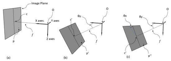 We want now to define the position of the point p in the local coordinate systems after the rotations defined by Euler angles. As shown in Figure 1 and Figure 2, the θz (yaw angle) is always equal to zero. Thus, the position of the point p remains unchanged, as well as the orientation of the image plane and the position of the center c. The rotation of the coordinates of the point p due to Pitch (θy) can be then calculated using Ry (see Equation (6) and Figure 3a,b).