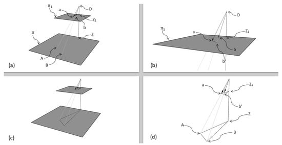The horizontal plane π1 is introduced in the model described in Figure 4. In this graphical representation, the image plane is not shown (a). Focus on the plane π1 (b). Whole model (c) and visualization of the homologous triangles A-B-Z and a-b-Z1 (d). (Source: personal collection).