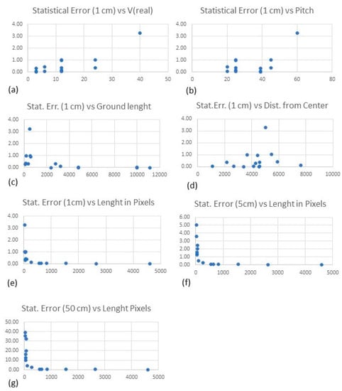 Parameters indicated in Table 1 plotted against the statistical error without considering the uncertainty of the Pitch angle (Statistical Error of 1cm versus real V (a), Statistical Error of 1cm versus Pitch (b), Statistical Error of 1cm versus Ground length (c), Statistical Error of 1 cm versus Distance from Center (d), Statistical Error of 1 cm versus Length in Pixels (e), Statistical Error of 5 cm versus length in Pixels (f), Statistical Error of 50 cm versus Length in Pixels (g). Ground length uncertainty equal to 1 cm is considered. Pixel length is also plotted against the statistical error when Ground length uncertainty is equal to 5 cm and 50 cm.