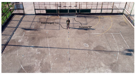 In this first field test, a wooden pole of 180 cm standing vertically from the ground was used as a target. This pole was used to avoid possible “collimation” with the top and bottom of the target (as we will see in the next section, it may not be easy to define the exact vertical bottom and top of a human being). The data were acquired in a flat area (an outdoor basketball court, see Figure 7). 10 still images were acquired with different camera pitch angles, and, in each acquired image, the principal point was always oriented over the pole (an arbitrary point along the pole, as described in Section 2.2). Images not properly oriented (principal point not located over the pole) were discarded and not used in this study. The camera Pitch angle and flight Roll angle of each image were extracted from EXIF tags, while the number of pixels spanning upward from the image principal point () and downward () were measured manually on screen.