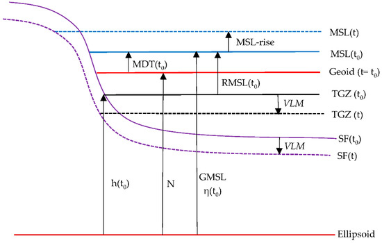 - Mean sea level (η, MSL) is the temporal average of the sea surface. The state of the sea level might be described by a time-mean long enough to exclude tidal influences (approximately 19 years). MSL is defined by its geodetic height (η) above the reference ellipsoid (negative if below) [30]. Epoch-based MSL at TGs (MSL) can be described using a linear expression technique defined as MSLTG(t) = MSLTG(t0) + (t − t0) MSLTG-trend, where the reference epoch is represented by t0 and MSLTG-trend, is the rate of sea level change in mm/year. However, MSL does not depict an equipotential surface because different height datums may refer to distinct equipotential surfaces, resulting in constant offsets between them.