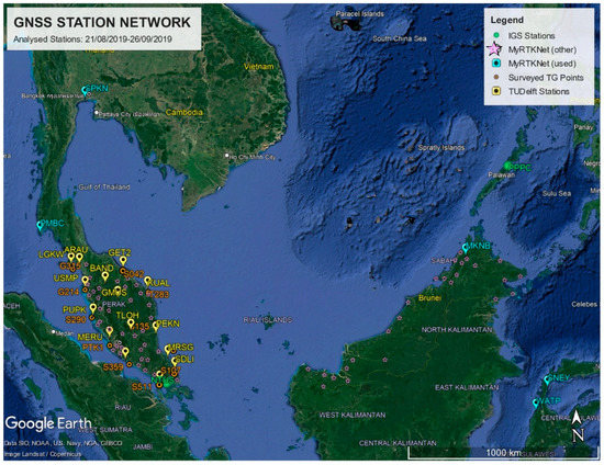 Overview of the GNSS stations that were used in the data analysis. In total, GPS data from 35 locations were used, including 11 TG points (in red), 15 MyRTKNet stations in Peninsular Malaysia (yellow place markers), 5 TUDelft stations (orange place markers) in Thailand, Eastern-Malaysia, and Sulawesi Indonesia, and 4 IGS stations (green dots) in Thailand, Singapore, and the Philippines. The other MyRTKNet station locations in Malaysia are also shown (yellow star markers). Source of Image: Google Earth Pro.