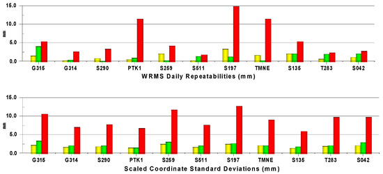 Overview of the IGS14 position error estimates for eleven (11) TG benchmarks in the north (yellow), east (green), and vertical (red) directions. TG benchmarks. In the top panel, the WRMS of the daily offsets with respect to the 6-day averaged solutions are shown (the daily coordinate repeatability). The bottom panel shows scaled (by a factor of 1.67) standard deviations of the 6-day averaged solution for each TG benchmark.