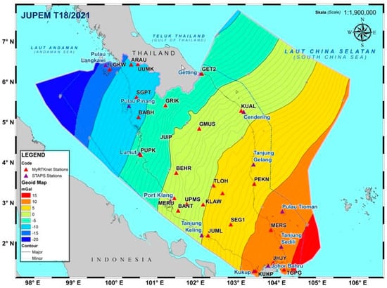 The current PMGVD height system is accessible only in areas close to existing levelling lines. The network is not extended over the interior or unhabitable regions, and expansion to the such area is prohibitively expensive and technically challenging. The modernisation of the height reference system envisages the realization of a new vertical reference frame; instead of traditional geodetic levelling, gravimetric geoid modelling referenced to MSL is used (e.g., Japan [5]; Taiwan [6]; Canada [7,8]; New Zealand [9]; and USA [10]). By using GPS or Global Navigation Satellite System (GNSS) positioning techniques, elevation measurements relative to a uniform and seamless height reference frame anywhere in the country are feasible. However, spatial coverage and accuracy of gravity data are fundamental issues that need to be considered for a precise (<5 cm) geoid model determination. Data on surface gravity in Malaysia are scattered, mostly limited to coastal plains, and of varied accuracy. In 2002–2003, an airborne gravity survey was conducted over the land and coastal zones of the Peninsula by DSMM in collaboration with Kort & Matrikelstyrelsen (KMS), a Danish geodata agency. A total of about 38,200 km lines of airborne gravity data were acquired at 5 km flight line spacing [11]. The final fitted geoid of Peninsular Malaysia, known as PMGeoid2003, was established by tightly fitting it to 145 GPS-levelling points. However, it should be pointed out that the final hybrid gravimetric-geometric geoid model PMGeoid2003 may inherit possible systematic errors from the GPS-levelling and thus no longer constitute an equipotential surface [11,12]. Based on the studies carried out by DSMM, it was found that the achievable accuracy of GNSS levelling in Malaysia was at the second-order levelling standard [2,13].