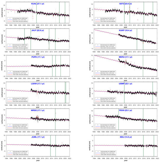 VLM estimates from 12 MyRTKNet stations located near the TG stations in Peninsular Malaysia. The vertical position time series for each station, as well as the overall observation period, are provided. The vertical reference position is specified on 1 January 2002 (0 cm). The green vertical lines are the epochs at which a vertical position jump (due to antenna change or MASS to MyRTKNet transition) was estimated. The linear trend line is given in blue, with the modelled seasonal (annual) signal superimposed on it. The VLM estimates come from the linear regression through the weekly averaged positions (black dots). Weekly averaged position outliers are marked in red. The VLM estimate is given at a confidence level of 95% (1.96 sigmas).