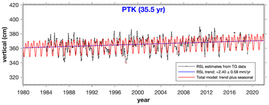 Previous analyses indicate that the annual and semi-annual cycles are the most prominent. Another study by Simons et al. [38] shows that Peninsular Malaysia is affected by the seismic cycle of “nearby” megathrust Earthquakes due to the tectonic setting of the region. Some TGs exhibit unusual behaviour prior to and after the 9.2 Mw Andaman-Sumatra Earthquake on 26 December 2004, which occurred along the Sumatra Fault. This behaviour results in different VLM rates, which affect both GNSS and TG data. Therefore, we chose not to include this difference in this study to establish a long-term (30+ years) RMSL. We also decided not to average the data over the given time span, which results in MSL2022A, but rather to evaluate the linear part of our model at the epoch 1 January 2022, resulting in MSL2022B. Depending on the data time span, an average would not consider the secular sea level change; this would introduce differences in the averaging period as well as changes in the midpoint of these periods from one TG to the other, basically introducing differences in the treatment of the different TGs. We apply an iterative 3σ outlier criterion during fitting to filter out extremes, such as the 1997 low sea level event in the Indian Ocean brought on by the Indian Ocean Dipole (IOD). Since the glacial isostatic adjustment’s (GIA) impact is minimal, the results have not been adjusted for it. Additionally, it will exclude any cross-sectional comparisons between GPS, TG, and SALT. Figure 7 presents an example of this approach for the TG at Port Klang (PTK). The RMSL trend (blue line) is estimated at 2.40 mm/year. The red line represents the total model, which is trend plus periodic cycles, the black dots represent the underlying data, and the red dots with grey squares represent our monthly averages and outliers.