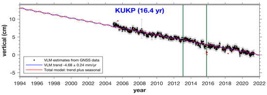 MASS and MyRTKNet GPS data were also processed by the GIPSY-OASIS software and the same daily solution processing procedure as previously described [38]. Following that, weekly averaged station positions were calculated to screen for outliers and improve the reliability of the coordinate solutions. The weekly averaged station coordinates’ daily repeatability (WRMS) from 1994 to 2021 (all in mm) are 1.1/1.2/4.4 (12 MASS + MyRTKNet stations) in the north, east, and vertical position components, respectively. The daily GPS positioning findings from MASS + MyRTKNet stations show that their VLM can be used to monitor the changes in the vertical motion at the nearby TGs at the mm level. These RMS values demonstrate the absolute accuracy of the daily station coordinates in the IGS14 global reference frame, given that all daily station locations were directly mapped in IGS14 using the X-file method. The velocity estimates for all stations were then computed from the weekly averaged coordinate solutions in the IGS14 by using a 3D-linear regression approach on the position time series, where station KUAL (Kuala Terengganu) has the longest total length of GPS observations (27.1 years, including the Geodynamics of South and South East Asia (GEODYSSEA) campaign type measurements between 1994 and 1998) [40]).
