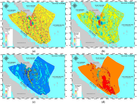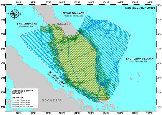 A combination of airborne datasets of land and maritime areas of Peninsular Malaysia is covered by a total of 68,200 km flight lines (refer to Figure 9 and Table 8). During the airborne data acquisitions over land and marine extent of the Peninsula, Antonov-38 and Beechcraft-BE200 aircraft were used, respectively. The details of the campaigns are presented in Table 8, in which a flight line spacing of 5 km was maintained over the land area for the MyGeoid Project (2002–2003). After flying more than 30,000-line km of flights, the 2022 survey supplemented the 2019 offshore survey of the South China Sea and the Malacca Strait, resulting in nearly complete coverage of the Peninsular Malaysia Exclusive Economic Zone (EEZ).