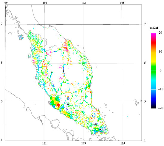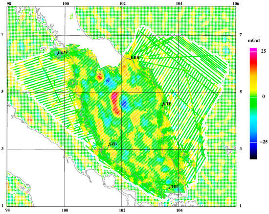 The gravity disturbances δg (i.e., anomalies computed using ellipsoidal heights) were estimated for all three sensors, then converted to classical geodetic free-air anomalies Δg (based on orthometric heights) using the XGM2019 geoid (NXGM2019) and applying an altitude-dependent atmosphere correction (δgATM) as follows: Δg = δg − 0.3086 NXGM2019 + δgATM. The use of geodetic gravity anomalies Δg ensures consistency with the earlier airborne surveys of Peninsular Malaysia and with the surface gravimetry from DSMM (Figure 10). The final processed airborne gravity data were evaluated by crossover comparison, yielding an RMS crossover of around 2.2 mGal, corresponding to an estimated RMS error of 1.6–1.7 mGal, at a spatial solution of 5–6 km with the used filtering, which is a highly satisfactory result.