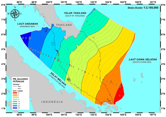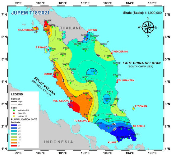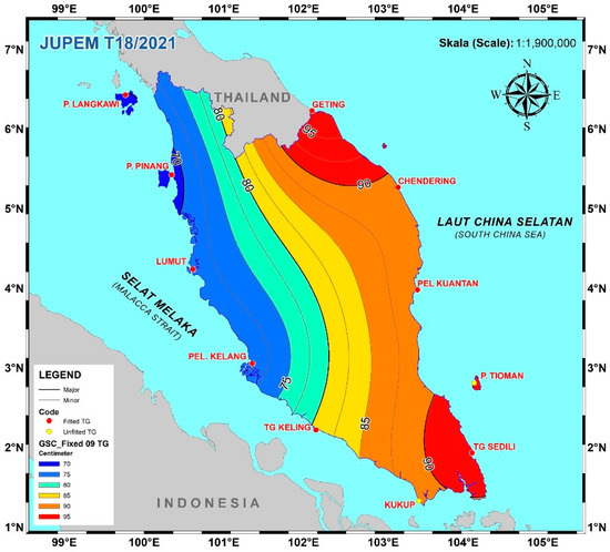The Geocentric Datum for Malaysia 2020 (GDM2020) is the latest geodetic reference system, which is more accurate and robust, and it has been developed to be fully aligned and compatible with ITRF2014 [21]. The semi-kinematic GDM2020 incorporates a regional crustal motion model, allowing users to have accurate and continuous access to the national reference frame both on land and marine areas using GNSS positioning services. Nonetheless, a new geodetic height reference system is urgently needed for Peninsular Malaysia to address the following issues: (i) non-uniformity of the existing local vertical datums; (ii) impacts of the sea level rise; and (iii) other oceanographic phenomena acting on the Peninsular Malaysia’s east and west coasts. The methodology for the realisation of a new epoch-based height reference system is provided in Section 2.1. Section 2.2 describes TGs’ vertical stability analysis incorporating the VLM model. Section 2.3 examines the trend and variability of the mean sea level around the Peninsular from TG records data. Section 2.4 describes a newly established precise and seamless land-to-sea gravimetric geoid model (PMGeoid2022) derived from terrestrial and airborne gravity data over land and marine zones of Peninsular Malaysia. The referencing of the gravimetric geoid with reference to the new MSL2022 values at TON’s stations throughout Peninsular Malaysia, as well as the re-examination of the existing PLN, are provided in Section 3. Lastly, Section 4 describes the new vertical datum for Peninsular Malaysia, which is PMGVD2022. PMGVD2022 and GDM2020 will collaborate to implement an epoch-based height reference system to assess effective sea level rise impact.