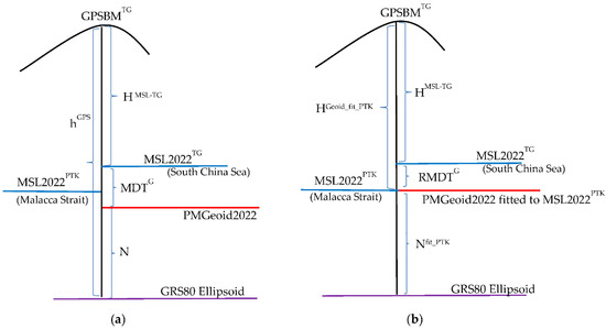 Conventionally, spirit levelling has been used to establish and maintain the majority of national vertical datums or height reference systems, with local mean sea level (MSL) at one or multiple tide gauge (TG) stations serving as the zero levels. A vertical datum defines a reference for elevation comparisons and is required for a wide range of applications that rely on fluid flow, such as floodplain management, roadway and drainage design, agricultural management, and surveying in general [1]. The Land Survey Datum 1912 (LSD12) was the first official national vertical datum for Peninsular Malaysia. LSD12 was referred to as the MSL value derived from eight months (1 September 1911–31 May 1912) of tidal data observed by the British Admiralty hydrographic survey vessel HMS Waterwitch at Port Swettenham (currently known as Port Klang) [2]. The Department of Survey and Mapping Malaysia (DSMM) established the first precise levelling network, known as the first order levelling network 1967 (FOLN67), which is referred to as LSD12 [2,3]. FOLN67 was established to provide heights above MSL for Peninsular Malaysia, including Penang, Langkawi, and Tioman Islands. LSD12 has served surveying and mapping communities in Peninsular Malaysia for over 80 years.