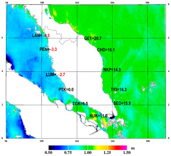 Meanwhile, the effects of climate change on sea level change are becoming more and more worrying. Sea level rise is the term used to describe the rise in ocean levels caused by the consequences of global warming [14]. The amount of heat absorbed by the seas and the quantity of land ice melted by a warmer atmosphere and oceans cause a long-term shift in sea level [15]. Coastal sea level with respect to the land surface is the area of most practical interest for evaluating the societal implications of sea level change. TGs measure relative sea level, which is affected by global mean sea level and its regional fluctuations, vertical land motion, small-scale currents, waves, wind, shelf bathymetry, freshwater intake from river estuaries, as well as along-shore and cross-shore sediment transport [16]. Peninsular Malaysia is situated in the centre of the Sunda Shelf, bounded to the east by the South China Sea, the largest marginal sea in the Pacific Basin, and to the west by the Andaman Sea, which is part of the Indian Ocean, as seen in Figure 1. Nevertheless, the low-lying coastal areas of Peninsular Malaysia are threatened by the adverse effects of sea level rise due to increased frequency and severity of coastal flooding and inundation, coastal erosion and saltwater intrusion [17,18]. Sweet et al. [15], on the other hand, indicated that the relative sea level throughout the contiguous United States coastline is predicted to increase by as much as 0.25–0.30 m on average during the next 30 years (2020–2050), about the same value as recorded before over the last 100 years (1920–2020). Accurate elevation data linked to an updated localised height reference datum are thus crucial for assessing the risk of sea-level rise and coastal floods [19,20].