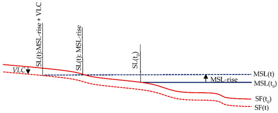 - Vertical land motion (VLM). The level of the sea floor (SF) fluctuates over time owing to solid-Earth tides, accumulation of sediment, and VLM. VLM refers to either subsidence or uplift, and its sources include isostasy, elastic flexure of the lithosphere and plate tectonics in plate boundary zones. Some anthropogenic effects near coastal zones, such as extraction of groundwater and hydrocarbon, may cause subsidence and thus alter the coastline [30].