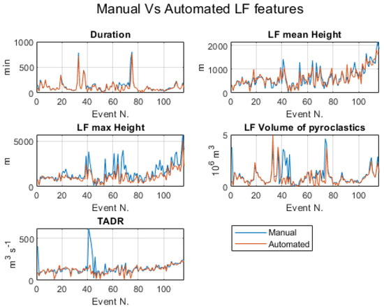 The differences are greater for the LF maximum height and relatively small for the durations and for the LF mean height, these last two being the parameters involved in the estimate of the pyroclastic volumes. We therefore conclude that using the software tool is acceptable at least for a quick estimate of the main features of the LF episodes.