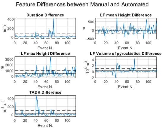Differences in duration, mean and maximum LF altitude, volume of pyroclastic material and TADR for each episode obtained by the manual and automated procedures. The solid horizontal lines in black represent the mean error, whereas the dashed horizontal lines indicate the standard deviation error.