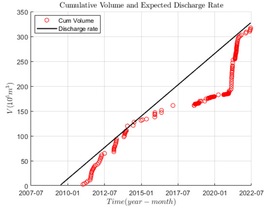Cumulative volume of lava flows and pyroclastic material (in millions of cubic meters) erupted by Mt. Etna between January 2011 and July 2022 considering both lava fountains and effusive eruptions (red circles), compared to the expected discharge rate (black line) of 0.8 m3 s−1 [18]. The values used can be found in the (Supplementary Material, Table S2) in the column “Cumulative Total Volume”. The graph starts from 2009 because it is the updated extension of the graph published by [18].
