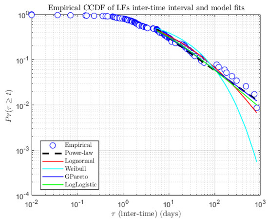 The comparison among the empirical CCDF, the power-law model and the alternative distribution models of LF inter-event times are reported in Figure 6 to enable a visual comparison. However, for an objective comparison between models, we report in Table 3 the negative log likelihood, which has been chosen as goodness of fit index. This index being a cost, then the lowest values are best.