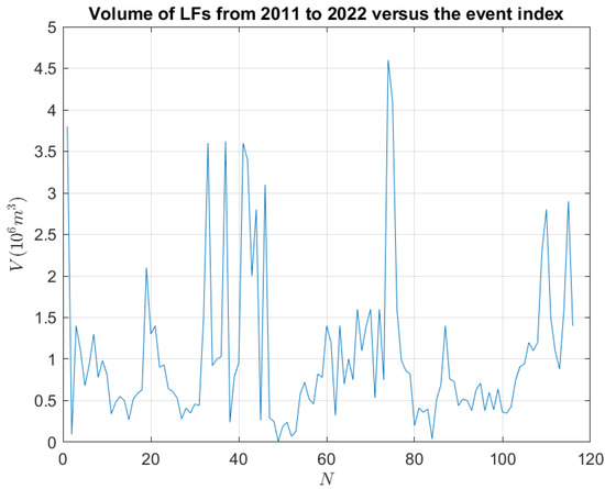 The pyroclastic volume associated with the 116 LF episodes listed in the Supplementary Material Table S1 is shown in Figure 7.