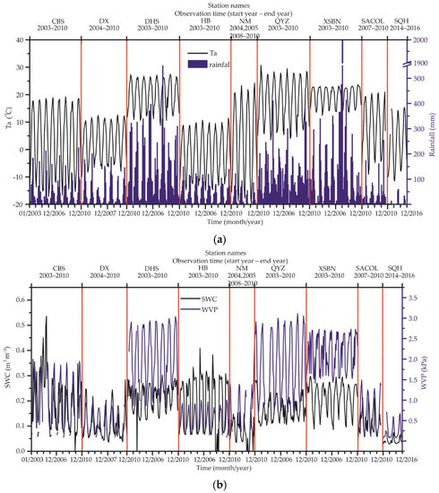 Time series of the different parameters in all observation sites in Table 2, in which the red dotted line distinguish the data between stations and in the lower abscissa, the interval between two scales is one year. Among them, (a) includes the monthly changes in Ta and rainfall; (b) includes the monthly changes in SWC and WVP; (c) includes the monthly changes in Rn, Hs, and LE; and (d) includes the monthly cumulative rainfall and TE calculated by Equation (1).