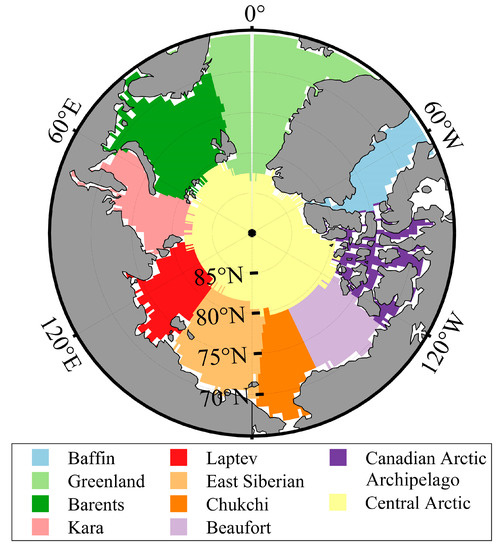 The Arctic was divided into 10 sectors: Baffin Bay, Greenland Sea, Barents Sea, Kara Sea, Laptev Sea, East Siberian Sea, Chukchi Sea, Beaufort Sea, Canadian Arctic Archipelago and central Arctic Ocean. These subregions were then delineated using a region mask provided by the National Snow and Ice Data Center (NSIDC, available online: https://masie_web.apps.nsidc.org/pub/DATASETS/NOAA/G02135/seaice_analysis/ (accessed on 11 September 2022)); this mask has been used in many Arctic studies and consists of 3912 pixels per scene in the polar stereographic projection centered on the North Pole. We selected the high latitudes north of 60°N and regridded the mask to a spatial resolution of 1 × 1° (Figure 1).