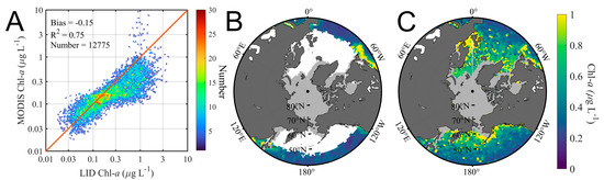 To validate the Chl-a results, we compared the global Chl-a values in the regions where ocean observations are available throughout the year from both CALIOP and the Moderate Resolution Imagining Spectrometer (MODIS) passive ocean color sensor. The MODIS data used in this study are Level-3 products with a spatial resolution of 9 km (available online: http://oceancolor.gsfc.nasa.gov (accessed on 16 July 2022)). At the global scale, we found excellent agreement (north r2 = 0.75, n = 12,775, p < 0.001) between the Chl-a values from the two sensors, thus lending confidence to the CALIOP retrievals (Figure 3A). In the polar zones, however, CALIOP continued to characterize Chl-a distributions right up to the ice edge throughout the extended periods when MODIS data were entirely absent (as shown, for example, in Figure 3B,C). This advantage of active LiDAR sensing allowed CALIOP to ‘fill in’ data in the late autumn to early spring seasons that have never been unlocked by other satellites due to solar radiation constraints and thus allowed CALIOP to construct a complete record of polar phytoplankton annual cycles [42].