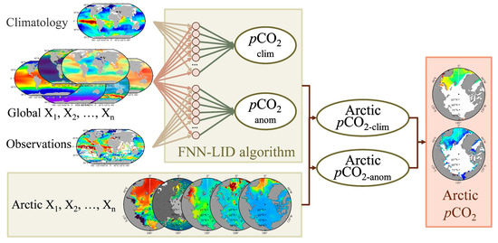 Illustration of the FNN-LID model: schematic description of the methodological flow for deriving diurnal ocean surface pCO2 products. The arrows indicate the flow of the FNN approach, and the green arrows indicate the product estimation procedures. The global data are used to build the model: FNN-LID. The bottom part means the Arctic data; we use this FNN-LID method and environmental parameters of the Arctic to generate the Arctic pCO2.