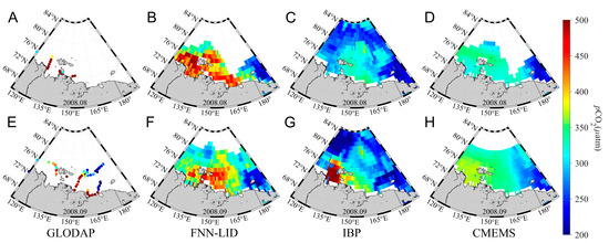 Maps of observed pCO2 from GLODAP in (A) August and (E) September 2008. Maps of sea surface pCO2 from (B) FNN-LID, (C) IBP and (D) CMEMS in August 2008 and from (F) FNN-LID, (G) IBP and (H) CMEMS in September 2008.