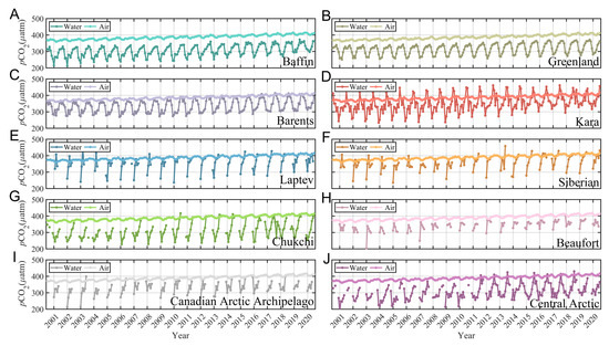 The long-time-series monthly pCO2 values in 10 sectors in the Arctic Ocean: (A) Baffin Bay, (B) Greenland Sea, (C) Barents Sea, (D) Kara Sea, (E) Laptev Sea, (F) East Siberian Sea, (G) Chukchi Sea, (H) Beaufort Sea, (I) Canadian Arctic Archipelago and (J) central Arctic Ocean. The light color represents atmospheric pCO2 and the dark color represents seawater pCO2.