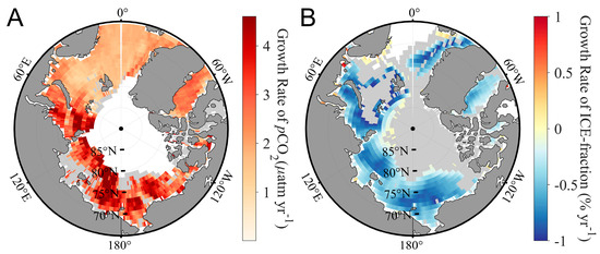 In addition, we also statistically estimated the trends of the spatial distributions of pCO2 and SIC declines (Figure 11A,B). We found that the growth rates of sea surface pCO2 were remarkable in regions with significant sea ice retreat, such as the East Siberian Sea and the Kara Sea. Based on years of observation measurements, Qi et al., 2022 summarized that when sea ice is lost, the well-buffered seawater with relatively high alkalinity and low pCO2 near the sea ice is diluted by the meltwater with relatively low alkalinity, high pCO2 and a low buffer capacity [81]. Thus, atmospheric CO2 invasion would result in greater overall declines in the pH and buffer capacity metrics in seawater diluted by meltwater compared to the original water. This ice-melt-driven mechanism can explain the amplified rapid increase in pCO2 observed in the Arctic Ocean over the past two decades.