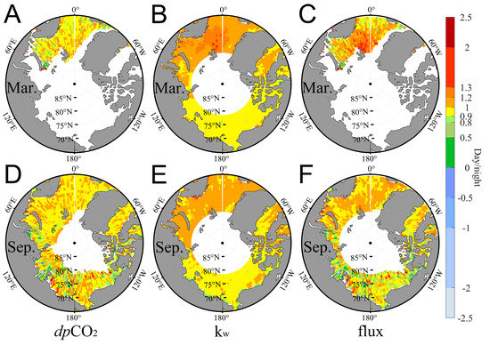 Ratios of daytime to nighttime (A) dpCO2, (B) kw and (C) air–sea carbon fluxes in March and of daytime to nighttime (D) dpCO2, (E) kw and (F) air–sea carbon fluxes in September.