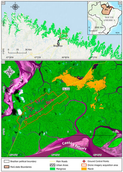 The northern Brazilian coast has the most extensive mangrove system globally, with an area of 7590 km2 containing 56% of Brazilian mangroves [28,29]. This region is located in the Amazon Macrotidal Mangrove Coast (AMCC) (Figure 1a), which is a global hotspot of intensive changes in mangrove coverage [14]. The Bragança-PA Peninsula is situated within the AMCC and is covered by an extensive mangrove area (Figure 1b) with tree heights up to 25 m [30]. Degraded mangrove areas are found close to the center of the Bragança Peninsula, on the highest tidal flats [31]. This degradation may be related to the construction of the Bragança-Ajuruteua highway (Highway PA-458) during the 1970s [31,32].