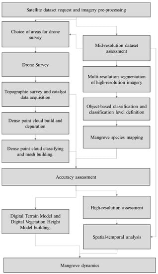 Multi-source remote sensing datasets (e.g., Satellite optical, SAR, or drone) can provide complementary information for mangrove assessment and drivers responsible for degradation and regeneration [15,16,17,18,19]. Landsat mid-resolution satellite datasets provide advantages for historical mangrove analysis due to the availability of their archives since the 1980s [20]. However, Landsat’s coarse spatial resolution is not at a fine enough scale to allow mangrove species monitoring [21]. Therefore, for mangrove species mapping, high-resolution datasets offer a cost-efficient method to obtain detailed information [18,22]. Alternatively, drone-derived data can provide additional canopy height and mangrove substrate topographic information [23,24,25,26], with the advantages of a brief time required to sample mangrove forest areas of low accessibility [27].