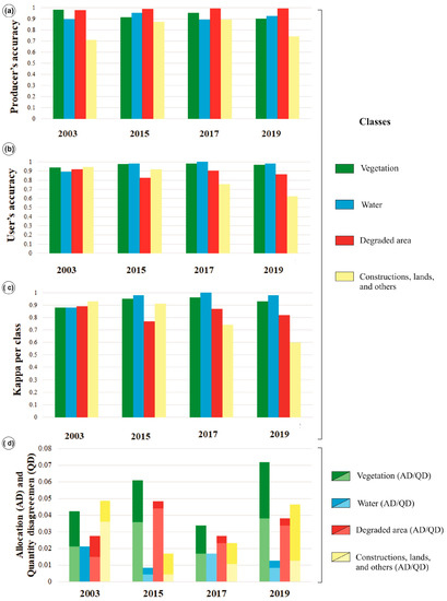 The overall accuracies are 0.93 for 2003 and 2015, 0.95 for 2017, and 0.92 for 2019. The producer’s accuracy for the vegetation class is above 0.90, and for the degraded-area class is above 0.97 (Figure 5a). Broadly, users’ accuracy for vegetation class is above 0.94 and 0.90 for the degraded areas (except in 2019) (Figure 5b). Therefore, both degraded area and vegetation classes represent reliable data. Furthermore, the overall Kappa indices were 0.82 (2003 and 2015), 0.85 (2017), and 0.79 (2019). The Kappa per class for vegetation is above 0.93, and for degraded areas class oscillates between 0.77 and 0.89 (Figure 5c). On average, QD (~0.04) is higher than AD (~0.03) (Figure 5d), except in three instances: (1) the water class in 2003, where AD represents the only source of error; (2) the mangrove class in 2003 where AD and QD have the same value (0.021); (3) the mangrove class in 2017 where AD and QD are equivalent (0.017) (Figure 5d).