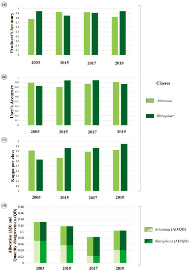 In general, level 3 classification accuracies are above 0.80. For the years 2003, 2015, 2017, and 2019, Avicennia class producer’s accuracies are 0.77, 0.93, 0.93, and 0.82, respectively, while Rhizophora class accuracies are 0.94, 0.85, 0.91, and 0.95 (Figure 6a). However, user’s accuracies for years 2003, 2015, 2017, and 2019 in the Avicennia class are 0.90, 0.80, 0.87, and 0.91, and in the Rhizophora class are 0.83, 0.94, 0.95, and 0.87, respectively (Figure 6b). Kappa overall indices are above 0.70, and Kappa per class indices oscillate between 0.60 and 0.80 (Figure 6c). Although the Kappa values have been low for some years, these are consistent with similar studies that classify mangrove species, e.g., [45,53,54]. In general, AD presents higher values than QD (Figure 6d), excluding 2003, where QD (0.07) in Rhizophora and Avicennia classes was higher than AD (0.06).