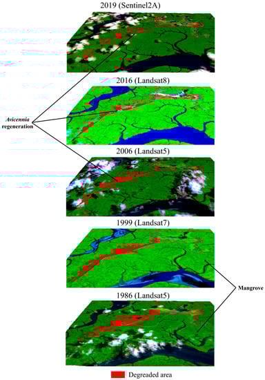 Degraded mangrove areas using mid and high-resolution images between 1986 and 2019.