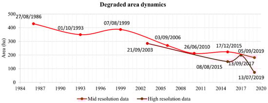 The mid-resolution dataset mapping revealed that degraded mangrove area decreased (Figure 6) from 429 in 1986 to 181 ha in 2019 due to natural mangrove recolonization (Table 3). Degraded area dynamics are summarized in Figure 7 and Figure 8. The general trend is a reduction in total degraded area, with two incremental pulses between 1993 and 1999 (+37.92 ha) and 2010 and 2015 (+11.30 ha), wherein the degraded area increased. The high-resolution dataset also shows an increase in the degraded area between 2015 and 2017 (+47.46 ha).
