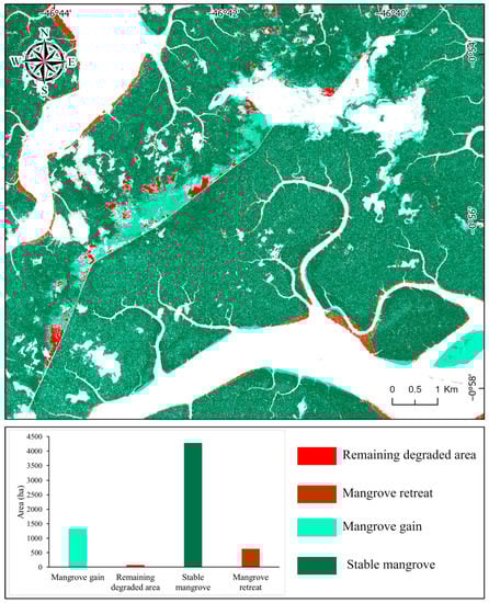 The high contrast in the spectral response between degraded areas and mangrove forests allowed us to map the degraded areas in the mid-resolution dataset manually. However, the high temporal resolution of this data contrasts with indistinguishable objects smaller than the pixel size (900 m2). Therefore, the degraded area borders mapping will be restricted by the uncertainties caused by the pixels with mixed coverages (e.g., herbaceous plants, soil, and water). These areas will have a spectral response resulting from an average reflectance between the different types of coverage that the pixel contains [55].