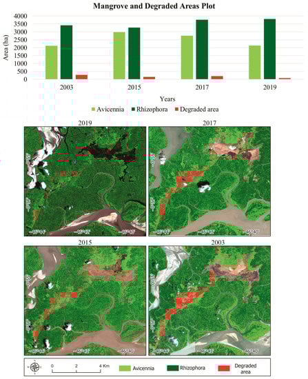 Changes in the mangrove degraded area between 2003 and 2019 using high-resolution images.
