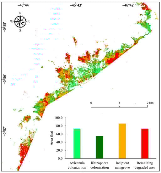 Therefore, a significant contraction in the degraded area from 284.60 to 72.90 ha occurred between 2003 and 2019 due to the recolonization of Avicennia (72 ha), Rhizophora (55 ha), and incipient mangrove (85.70 ha) (Figure 11). In this time interval (16 years), 74.5% of the degraded area was regenerated mainly by Avicennia trees and incipient mangroves. The low tree stature and dispersion of incipient mangrove recolonization hampered a clear identification of the mangrove genus. However, considering the Avicennia trees are the pioneers in the recolonization of the degraded area, the incipient mangrove area is likely comprised mostly of the seedlings of Avicennia.