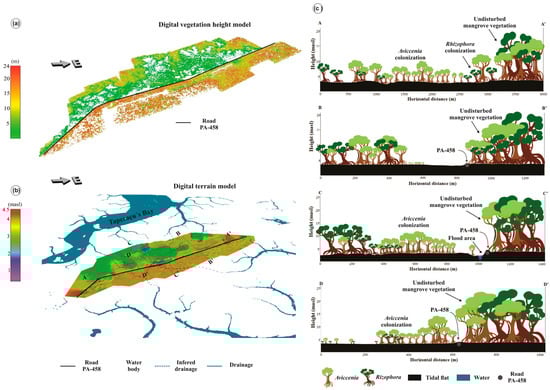 Digital Models for (a) vegetation height and (b) terrain. (c) Planialtimetric sections (A-A’, B-B’, C-C’ and D-D’) of the degraded mangrove areas near the center of the Bragança Peninsula related to mean sea level with the vegetation units and vegetation height.