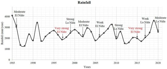 Annual precipitation values in the Bragança peninsula (mm) with the “El Niño” and “La Niña” phenomena for the analyzed scenes [58,59].