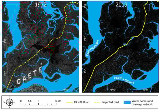 Located in the Bragança Peninsula, Highway PA-458 was built along 26 km of dense mangrove forests [37]. Before road construction, the mangrove cover was homogeneous, even in the middle of the peninsula [31,32]. The impacts of the road are not restricted to ecosystem degradation but also socio-economic effects, such as uncontrolled population growth and an increase in demand for fishing and extractive products [38]. An initial study by Cohen and Lara [31] inferred mangrove degradation in the western road sector; however, more recent studies show mangrove forests under stress on both sides [37].